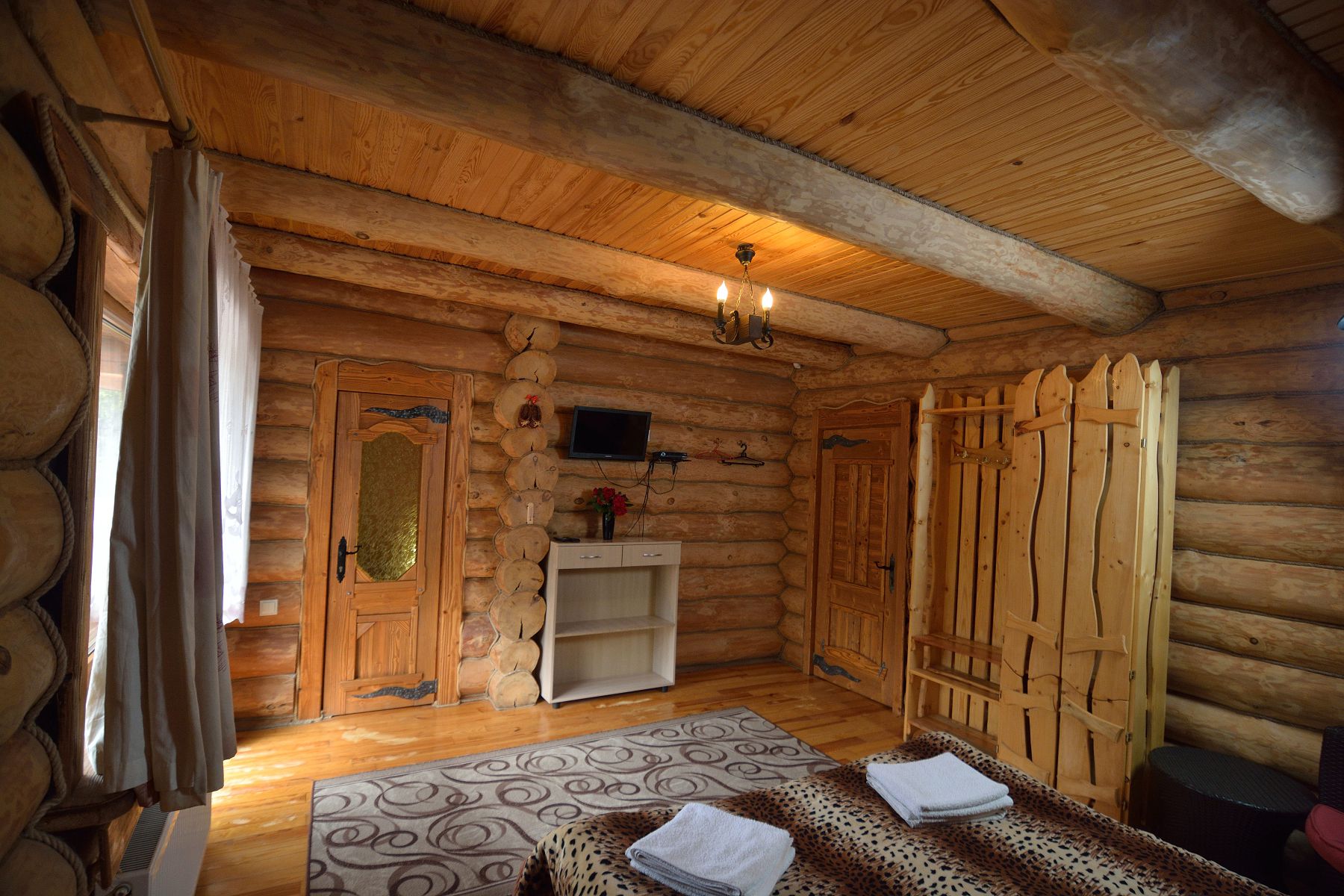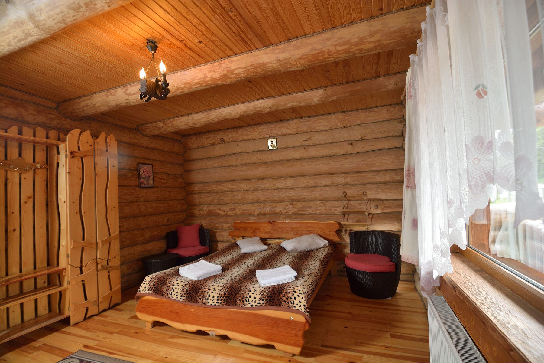 №5 КОМФОРТ - класичний однокімнатний номер розрахований на двох осіб, які бажають спокійного та комфортного відпочинку та знаходиться на другому поверсі комплексу. Номер оснащений дерев’яними меблями ручної роботи. Санвузол містить душову кабіну, умивальник, туалет.
